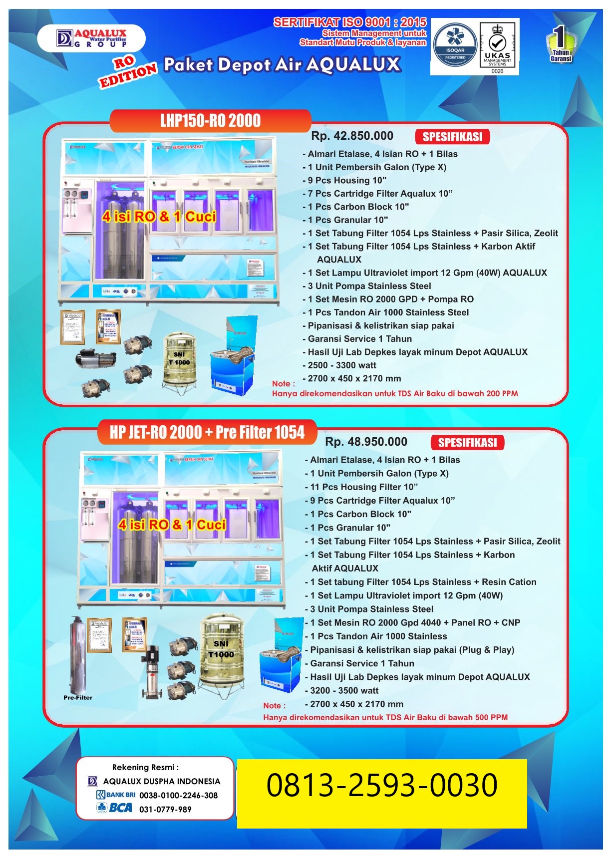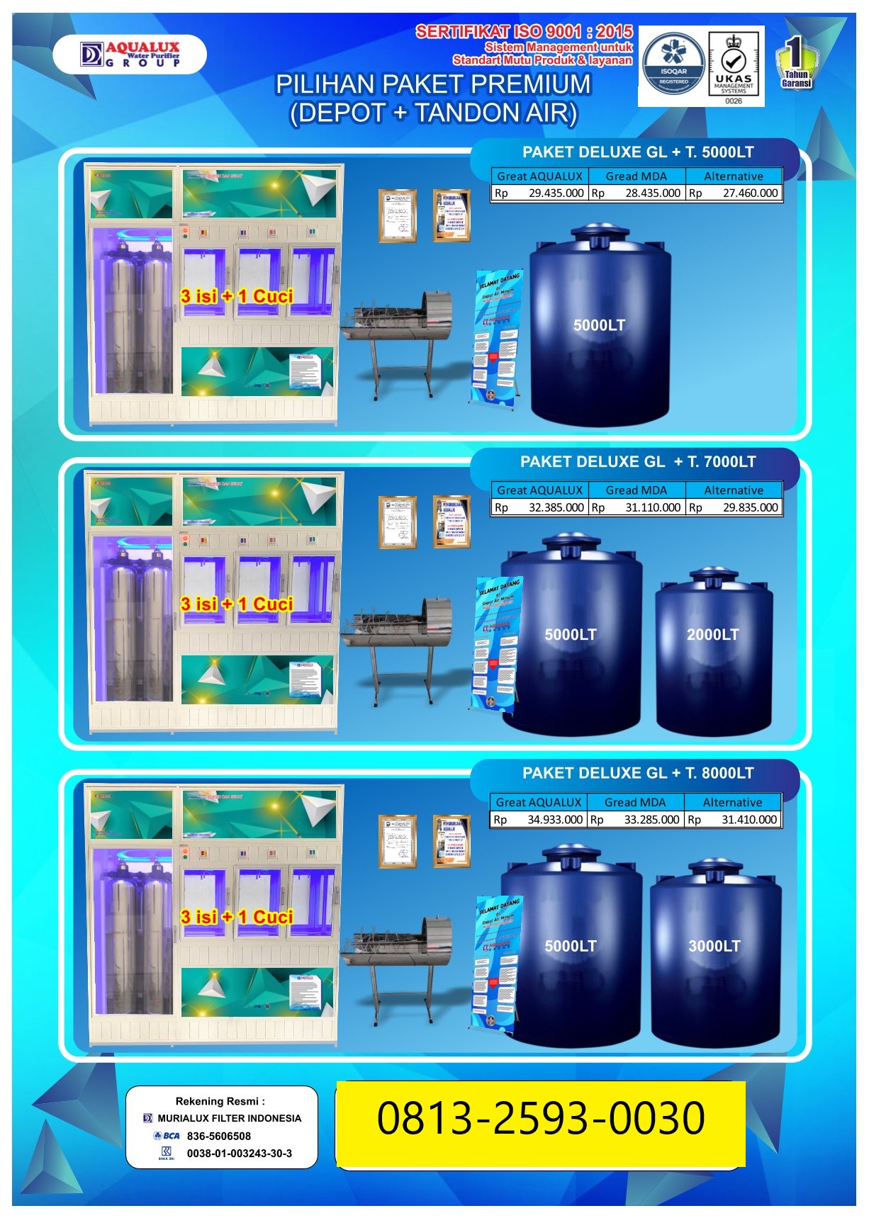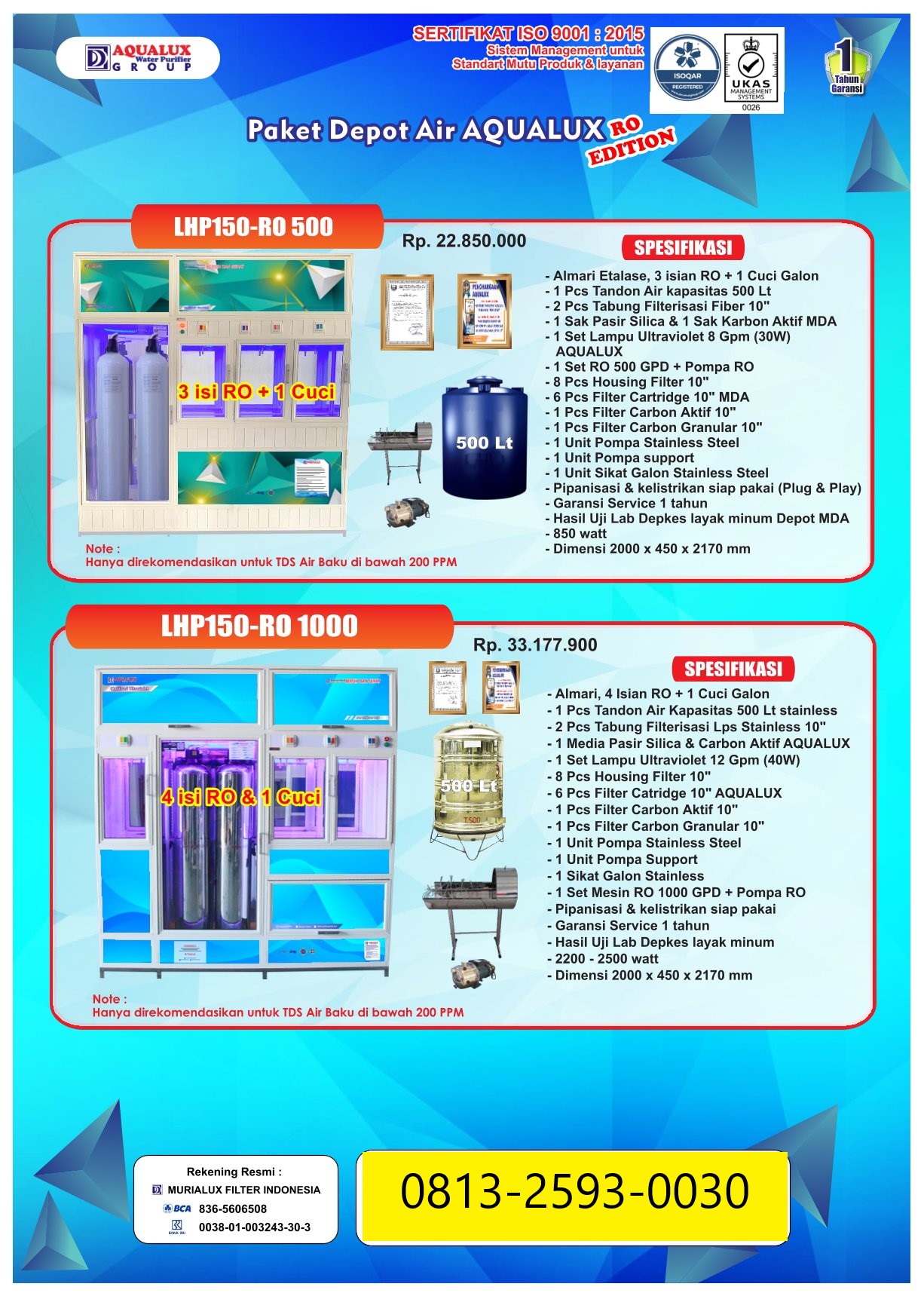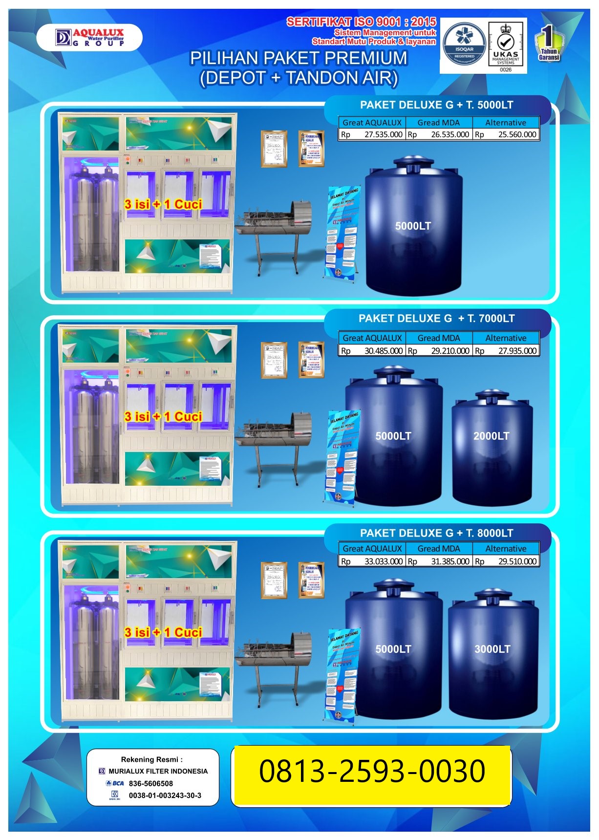 Mulai usaha depot air dengan mesin depot air minum isi ulang berkualitas tinggi. Terbukti telah digunakan ribuan pengusaha di seluruh Indonesia. Air lebih jernih, aman, dan siap dijual.