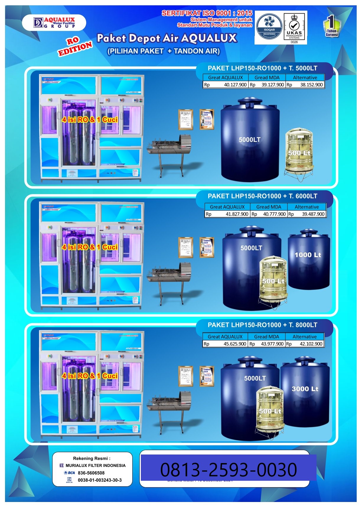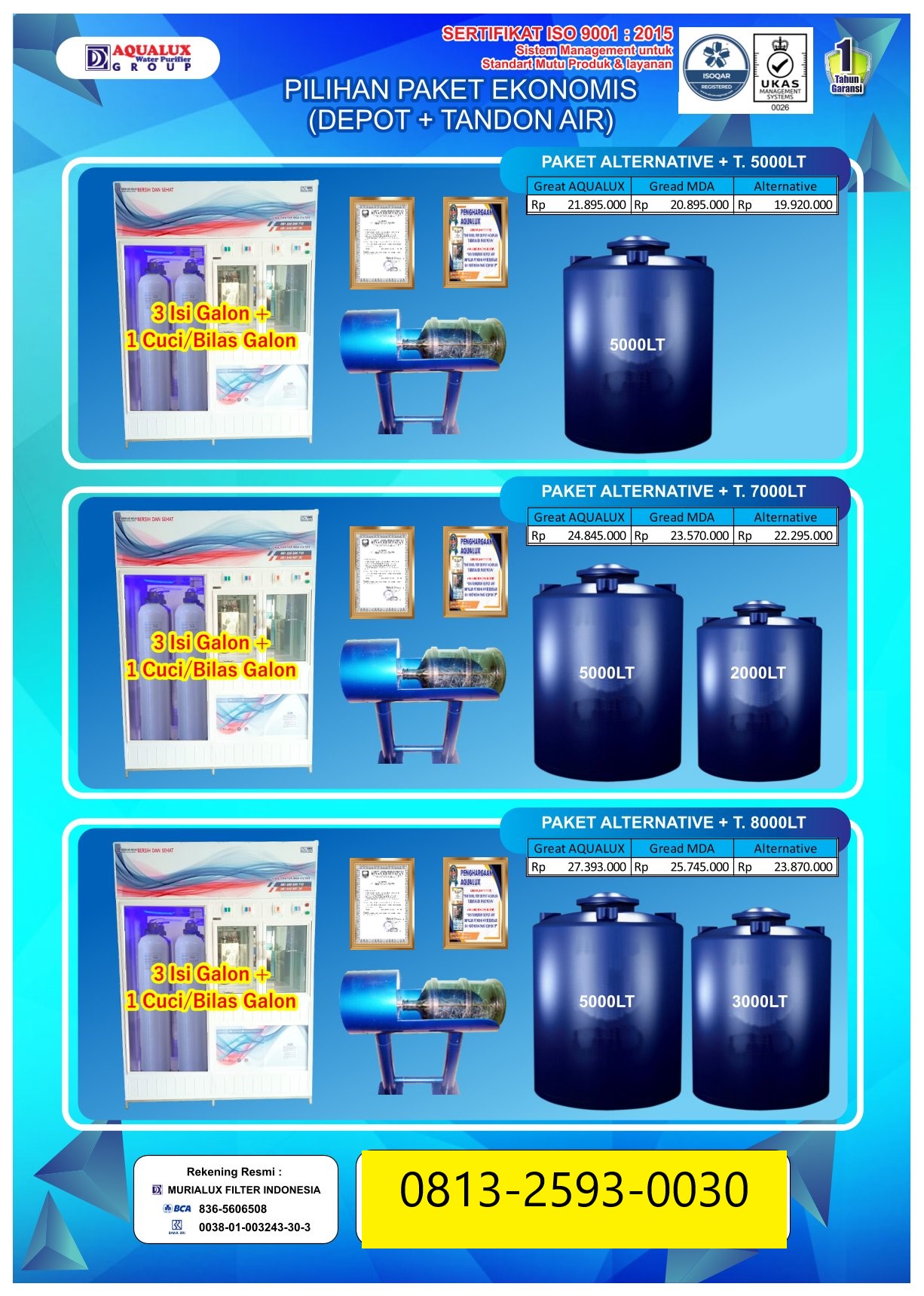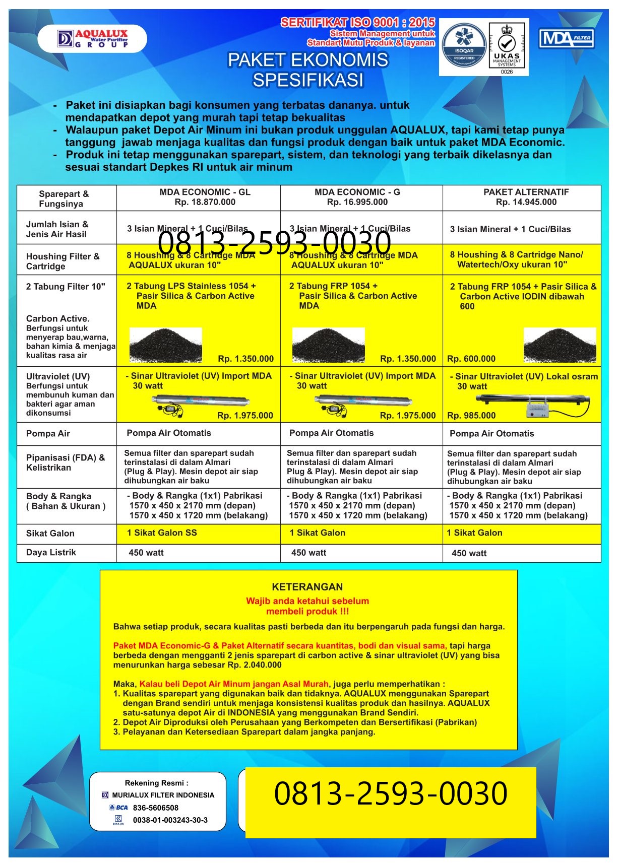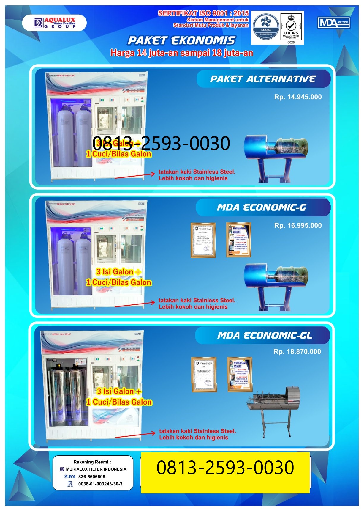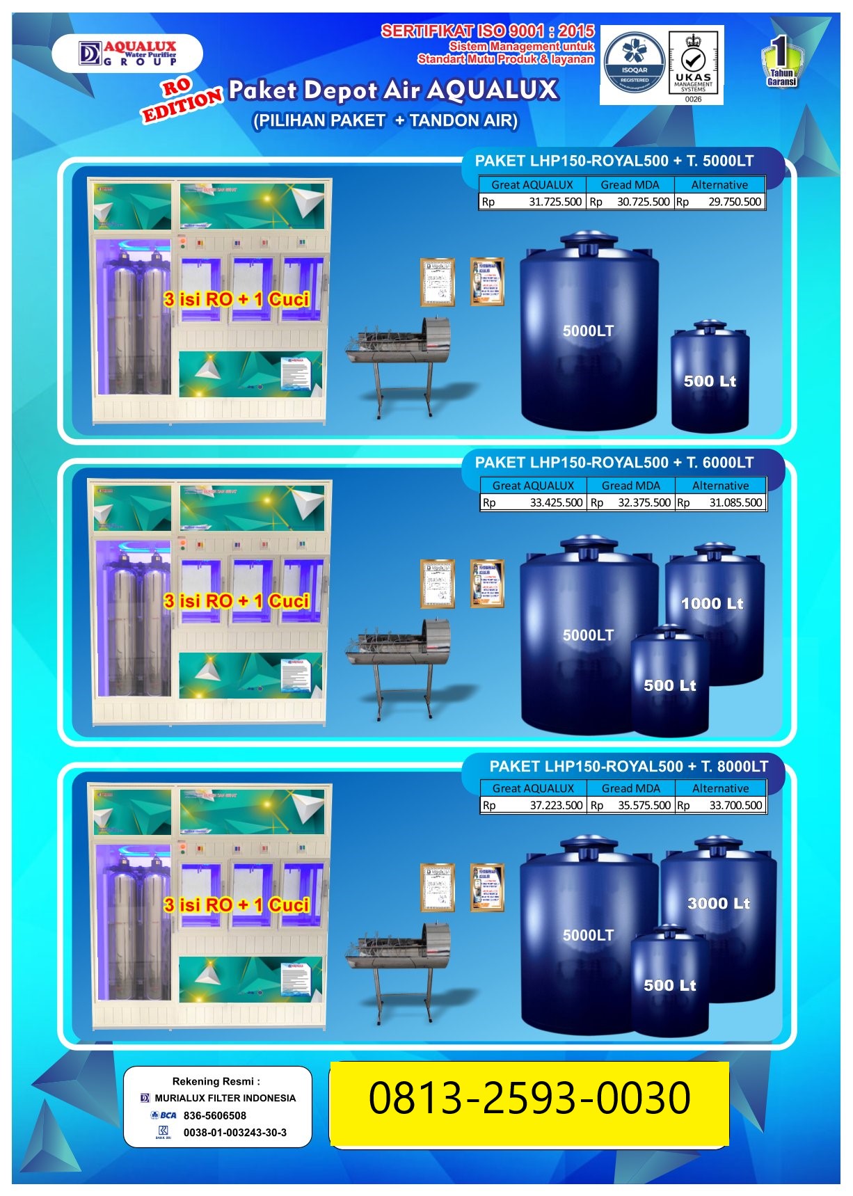 Mulai usaha depot air dengan mesin depot air minum isi ulang berkualitas tinggi. Terbukti telah digunakan ribuan pengusaha di seluruh Indonesia. Air lebih jernih, aman, dan siap dijual.